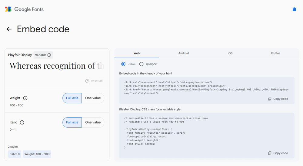 Select your second font on Google Fonts and copy the updated embed code.