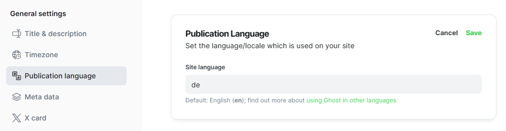 All text within the theme architecture is translated automatically based on the Publication Language set in your Ghost Admin settings.