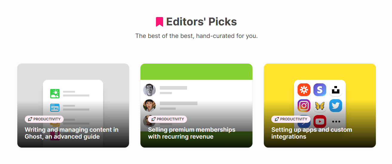 The Editor's Picks section highlights your most important content directly on the homepage. This section is dynamic and populates based on your "Featured" posts.