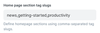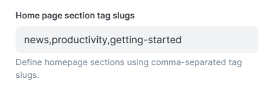 Under the Homepage settings tab, locate the Home page section tag slugs field.