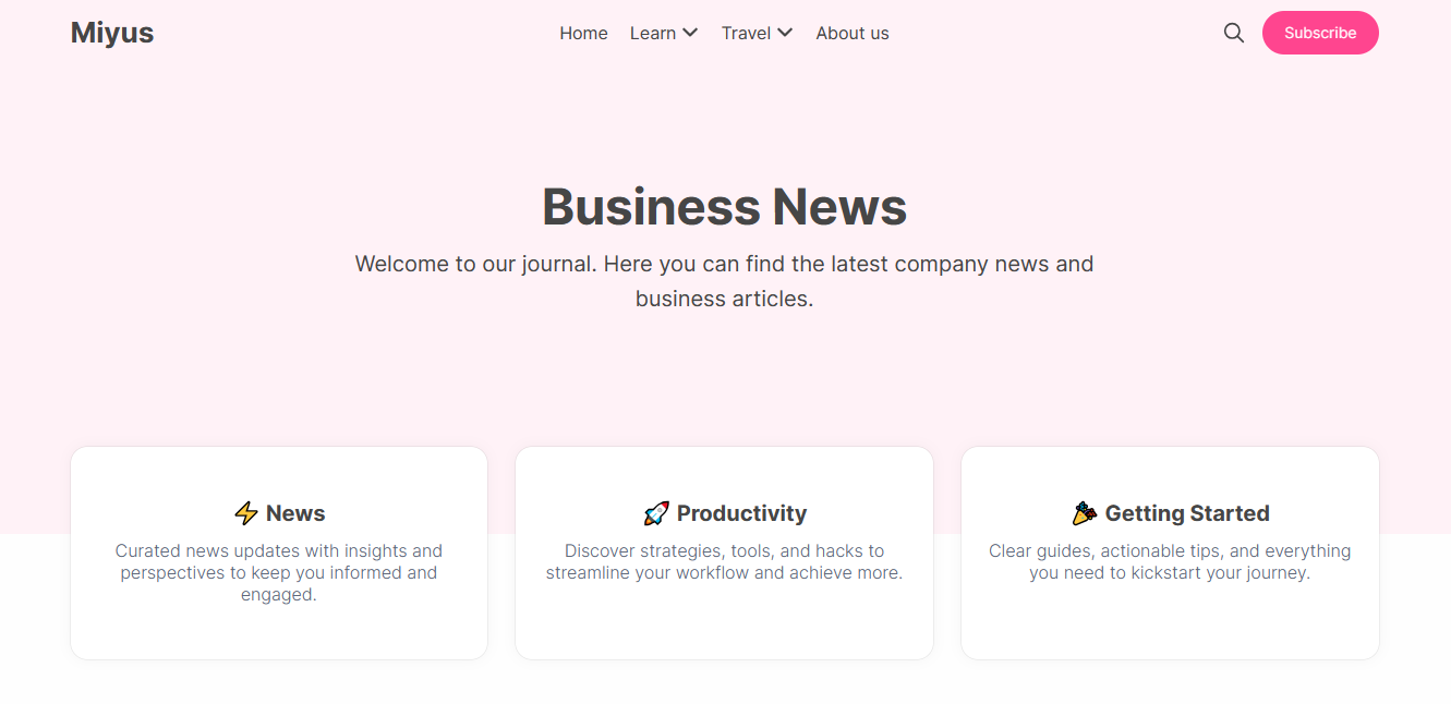 Create dynamic, tag-based categories on your homepage to group your content into logical sections. Each section displays the 3 most recent posts from that tag.