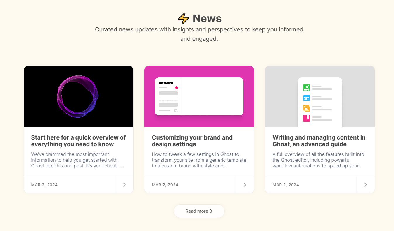 To display a post here, simply mark it as Featured in the Ghost Post Settings. If no posts are featured, this section will automatically hide itself.